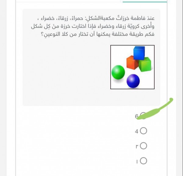 حل السؤال عند فاطمة خرزات مكعبة الشكل حمراء زرقاء خضراء وأخرى كروية زرقاء وخضراء فإذا اختارت خرزة من كل شكل فكم طريقة مختلفة يمكنها أن تختار من كلا النوعين