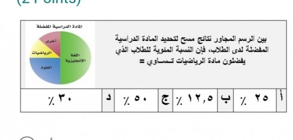 بين الرسم المجاور نتائج مسح لتحديد المادة الدراسية المفضلة لدى الطلاب فإن النسبة المئوية للطلاب الذين يفضلون مادة الرياضيات تساوي