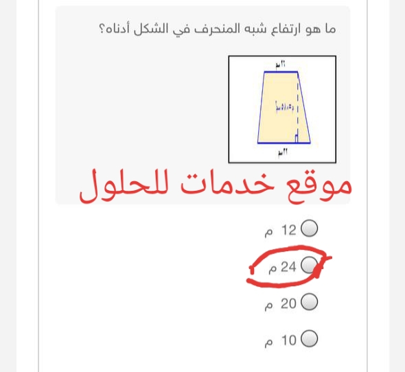أهلاً وسهلاً بجميع الزوار داخل موقع خدمات للحلول الذي يقدم الأجابات الصحيحة للأسئلة التربويه والتعليمية لمراحل التعليم للأجابة على أسئلتكم عليكم طرح أستفساراتكم وتعليقاتكم في صنوق التعليقات لنقوم بحل السؤال ماهو أرتفاع شبه المنحرف في الشكل أدناه