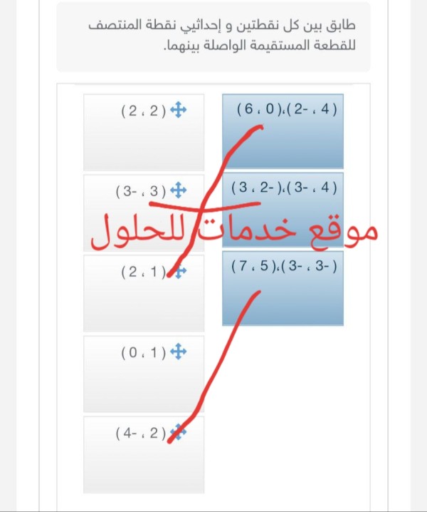 نرحب بكم في موقع خدمات للحلول يقدم أصح الأجابات لجميع الأسئلة التي يطرحها الزائر عبر تعليقاتكم وأستفساراتكم التي تتركونها في صندوق التعليقات نقوم بحل السؤال طابق بين كل نقطتين وإحداثيي نقطة المنتصف للقطعة المستقيمة الواصلة بينهما