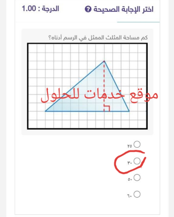 الدراسه والتعليم تنمي الثقافة في الدول العربية وتزود الطالب بالتوعية التعليمية من هنا، نجدحلول المناهج الدراسية لجميع مراحل التعليم الابتدائي والمتوسط والثانوي يجد الزائر الكريم الأجابات الصحيحه في موقع خدمات للحلول لحل السؤال كم مساحة المثلث الممثل في الرسم أدناه