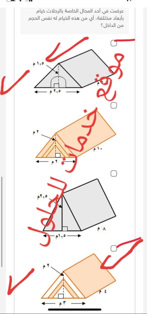 السؤال عرضت في أحد المحال الخاصة بالرحلات خيام بأبعاد مختلة أي من هذة الخيام له نفس الحجم من الداخل