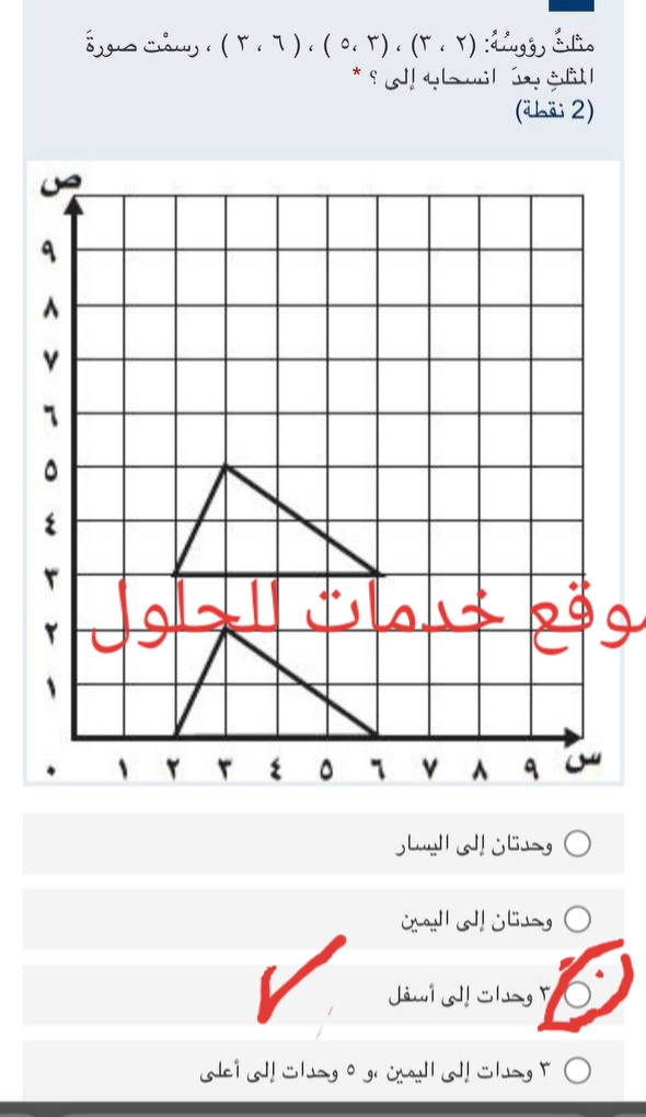 السؤال مثلث رؤوسة (٢، ٣)، (٣، ٥)، (٦، ٣) رسمت صورة المثلث بعد أنسحابه الى