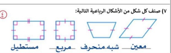 نرحب بجميع طلاب التعليم الباحثون عن حلول المناهج التعليمية بمختلف الأقسام العلمية والأدبية بيت العلم داخل موقع خدمات للحلول (khadamats) الذي يسعى إلى تزويد الباحث العربي بالثقافات العلمية، للإجابة على أسئلتكم التعليمية عليكم طرح أستفساراتكم وتعليقاتكم في صنوق التعليقات في مربع الأجابة الأسفل لنقوم بحل السؤال صنف كل شكل من الأشكال الرباعية التالية