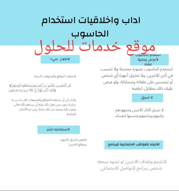 نرحب بجميع طلاب التعليم الباحثون عن حلول المناهج التعليمية بمختلف الأقسام العلمية والأدبية بيت العلم داخل موقع خدمات للحلول (khadamats) الذي يسعى إلى تزويد الباحث العربي بالثقافات العلمية، للإجابة على أسئلتكم التعليمية عليكم طرح أستفساراتكم وتعليقاتكم في صنوق التعليقات في مربع الأجابة الأسفل لنقوم بحل السؤال اداب واخلاقيات استخدام الحاسوب