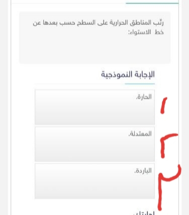 نرحب بجميع طلاب التعليم الباحثون عن حلول المناهج التعليمية بمختلف الأقسام العلمية والأدبية بيت العلم داخل موقع خدمات للحلول (khadamats) الذي يسعى إلى تزويد الباحث العربي بالثقافات العلمية، للإجابة على أسئلتكم التعليمية عليكم طرح أستفساراتكم وتعليقاتكم في صنوق التعليقات في مربع الأجابة الأسفل لنقوم بحل السؤال رتب المناطق الحرارية على السطح حسب بعدها عن خط الاستواء