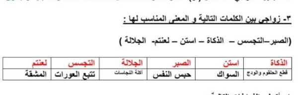السؤال زواجي بين الكلمات التالية و المعنى المناسب لها : (الصبر - التجسس - الذكاة - استن - لعنتم الجلالة)