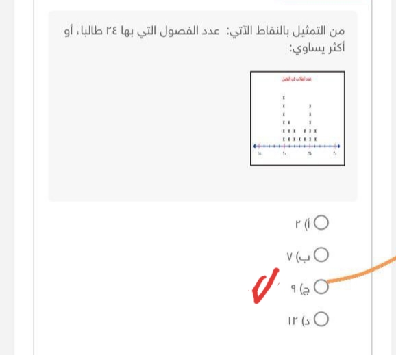 من التمثيل بالنقاط الآتي: عدد الفصول التي بها ٢٤ طالبا، أو أكثر يساوي: