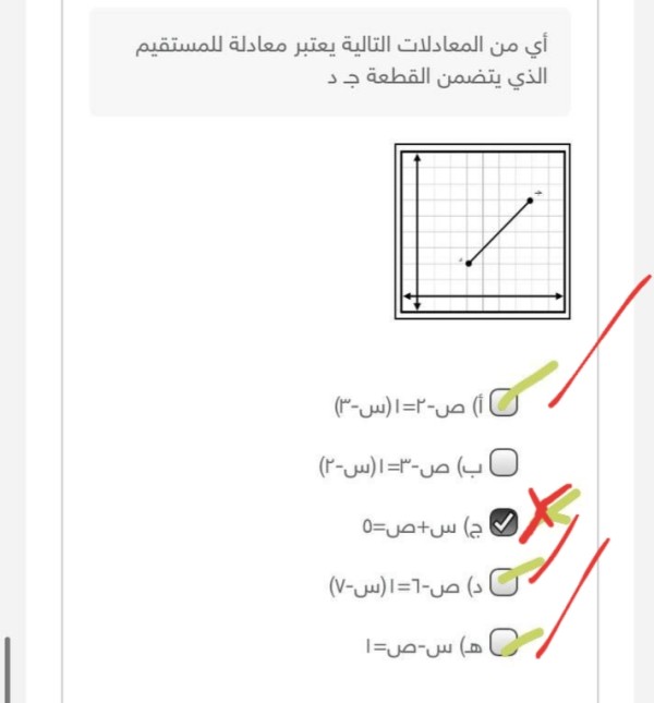 السؤال أي من المعادلات التالية يعتبر معادلة للمستقيم الذي يتضمن القطعة جـ د
