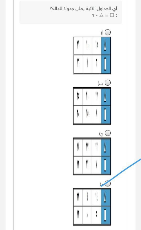 الأجابة هي : حسب الصورة نقوم بحل السؤال أي الجداول الآتية يمثل جدولا للدالة؟ □ = △ - ٩